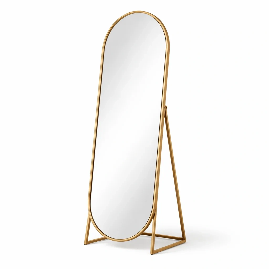 Descripcion:Espejo decorativo de pie con acabado dorado y diseno sofisticado. Proporciona gran estabilidad y reflejo nitido. Perfecto para espacios modernos, boutiques y habitaciones.